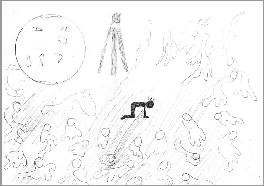 Allo slogan si accompagnano parte dei suoi disegni che nella progressione segnano LE TAPPE DI RIFLESSIONE E VERIFICA SULLE infinite precarietà umane, senza escludere il voluto distacco ISTITUZIONALE che si è trincerato nel silenzio a difesa di una roccaforte senza fondamenta culturale. La mente umana ha delle dinamiche di apprendimento che esigono metodi e ruoli di competenza e non improvvisazioni e ruoli precari.